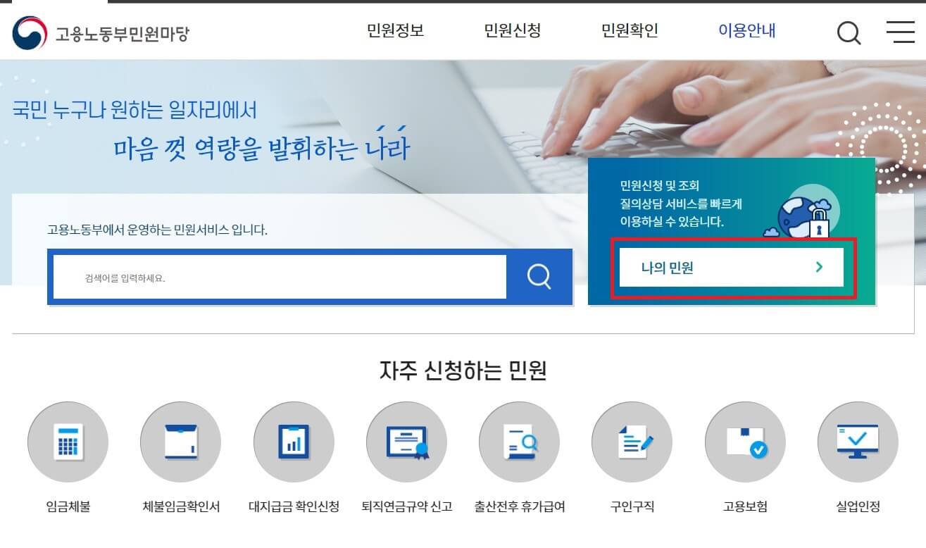 1) 먼저 고용노동부 민원마당 검색후 로그인합니다.
