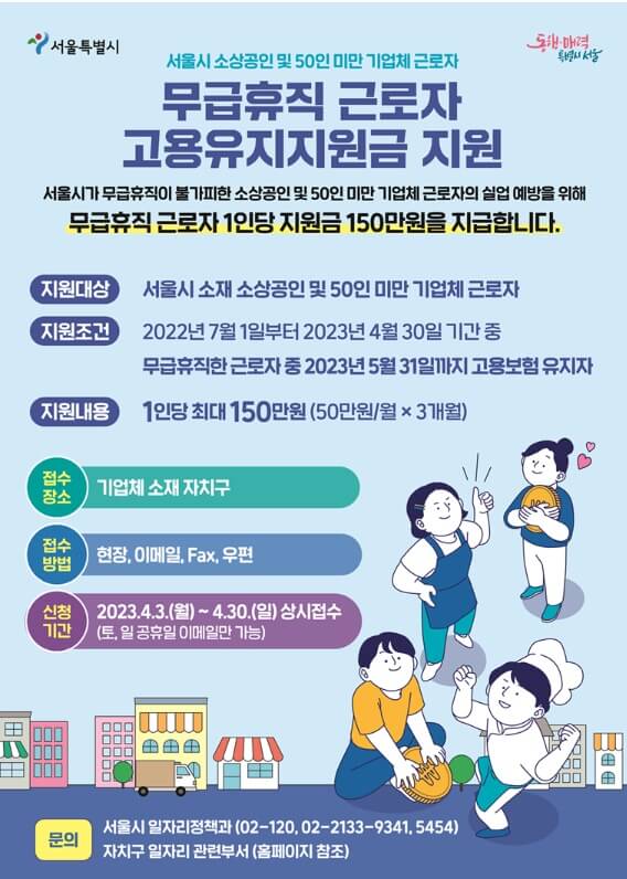 위 사업은 서울지역 50인 미만 기업체 근로자가 월 7일 이상 무급휴직한 경우 근로자 1인당 최대 150만 원(50만 원*3개월)까지 지원한다. 휴직기간은 2022년 7월 1일 ~ 2023년 4월 30일이고, 2023년 5월 31일까지 고용보험 유지 확인 후 6월에 고용유지지원금을 지급한다.